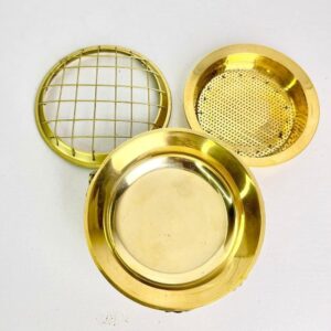 The Brass Incense Burner with Mesh Cover features a classic round design with a removable perforated mesh lid. This ensures even burning of incense materials while preventing sparks or ash spillage. The stable base allows safe placement during long rituals or meditation sessions.
