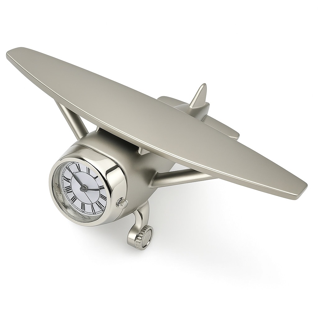 Bring aviation history to life with the Metal Airplane Table Clock, a stunning fusion of style and functionality. Crafted from premium silver-finished metal, this unique airplane-shaped desk clock features a Roman numeral dial and timeless design. Perfect for aviation lovers, pilots, and collectors, it adds sophistication to any home, office, or study.