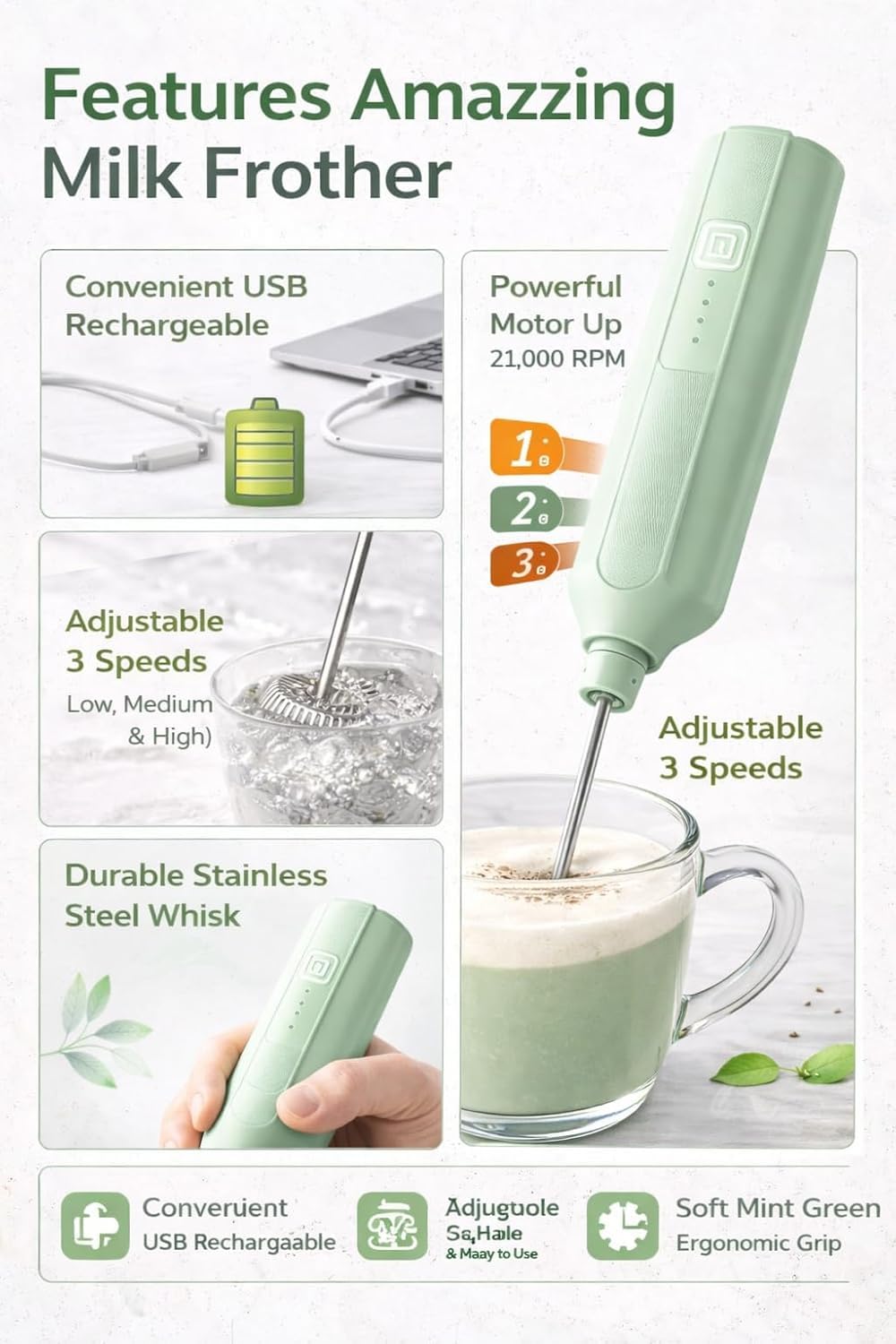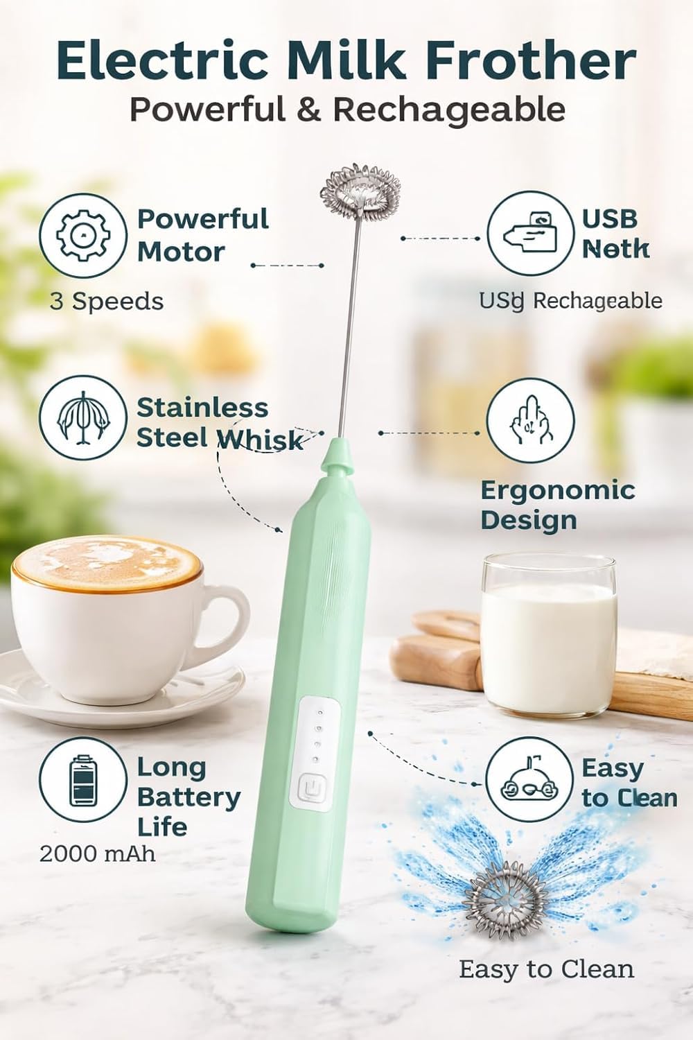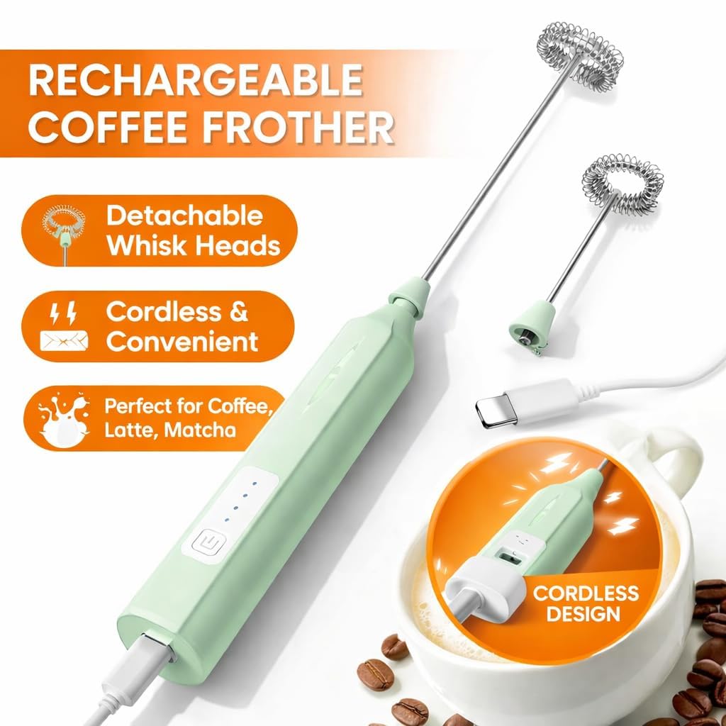 with this Rechargeable Milk Frother designed for coffee lovers and home baristas. The powerful motor and stainless steel whisk help you make smooth, creamy froth in seconds for lattes, cappuccinos, and hot chocolate. With its 3-speed control and cordless rechargeable design, this handheld frother offers convenience and versatility for everyday kitchen use. Lightweight, portable, and easy to clean, it’s perfect for home, office, or travel. Enjoy professional-quality beverages anytime with this stylish mint-green coffee frother.
