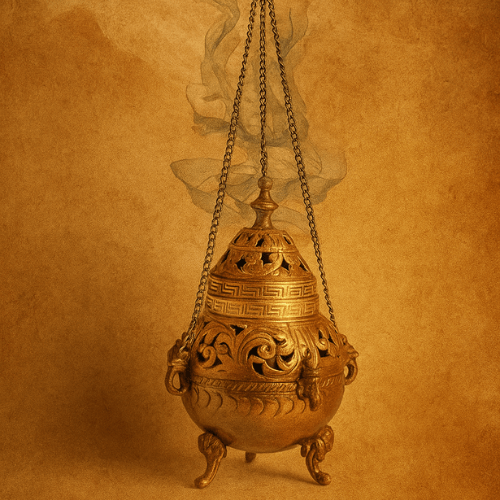 levate your space with this Vintage Brass Hanging Burner, featuring ornate carvings, tripod stability, and a chain for easy hanging. Perfect for incense & décor.