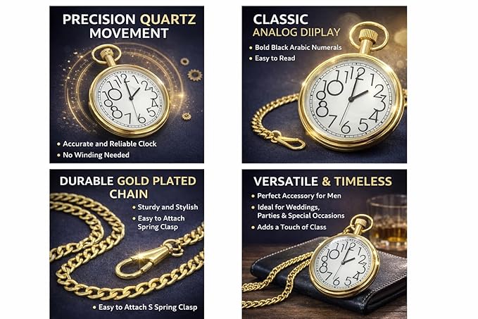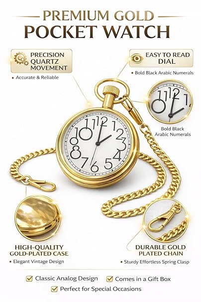 Vintage Pocket Watch represents elegance, tradition, and timeless style. Inspired by classic timepieces once carried by gentlemen and collectors, this pocket watch combines a retro aesthetic with reliable analog timekeeping. Its polished gold finish, white dial, and bold Arabic numerals make it both stylish and practical.