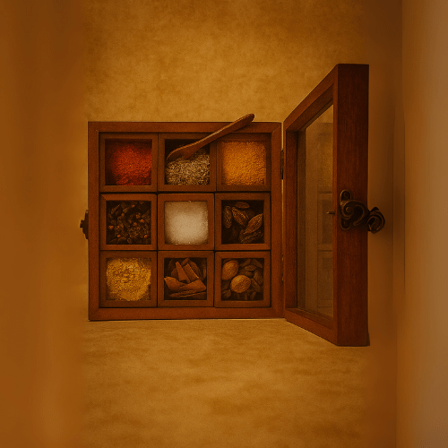 Crafted from moisture-resistant, durable wood, it blends perfectly with both traditional and modern kitchens. Each square compartment is ideal for storing turmeric, cumin, cloves, cinnamon, salt, and more — making it your go-to container for daily Indian cooking.